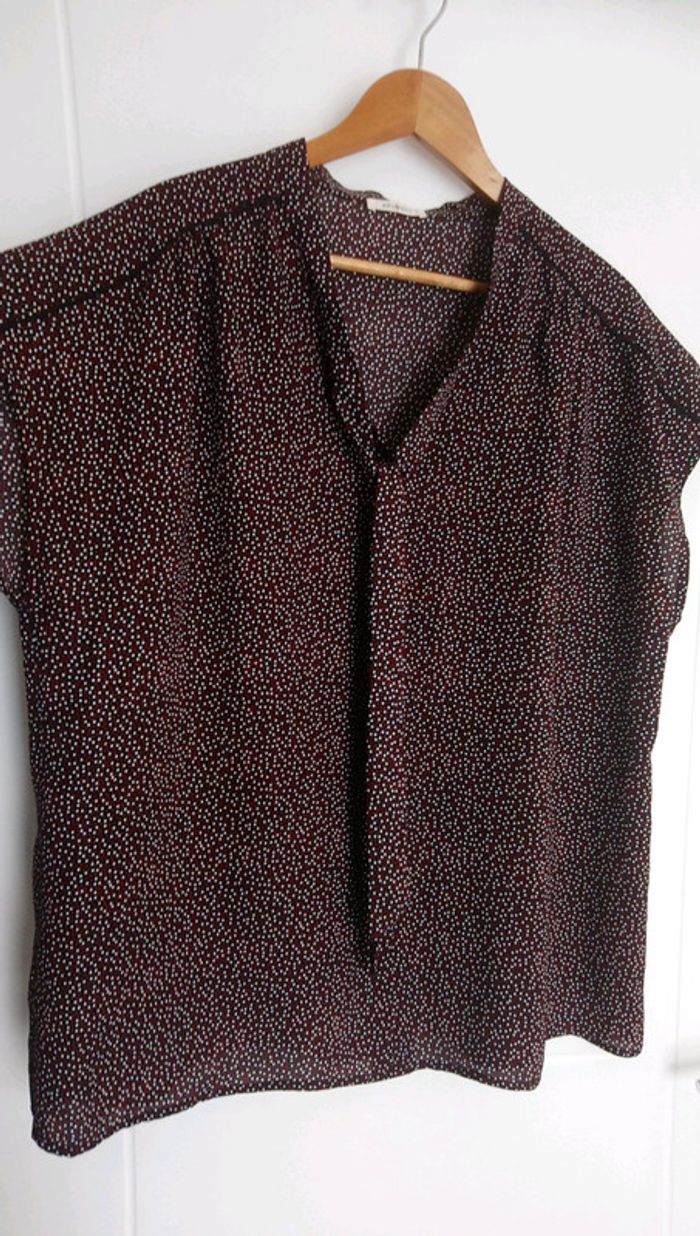 Top femme noir avec motifs à petits pois rouges et blancs, manches courtes, col en V avec 2 petites lanières, coupe droite, convient pour taille 42 /44 #cyboulette44femme