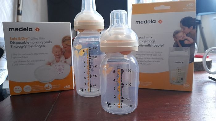 Bonjour, Je vends un lot composé de : - Coussinets d'allaitement jetables Medela (il reste un peu plus de la moitié de la boîte) - Sachets de conservation Medela (boîte pleine qui n'a jamais servie, elle a juste été ouverte) - 2 biberons Medela calma de 150 ml et 250 ml (mon bébé ne les a pas acceptés, ils n'ont servi qu'une seule fois et sont donc neufs pour ainsi dire) Valeur du lot : 30 € non négociables.
