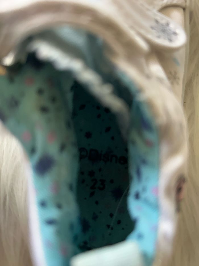 Très belle paire de baskets 🥰 elsa Disney pointure 23 Manque le petit tissu sur la semelle intérieure dans une chaussure mais ça ne gêne pas du tout car il y a la semelle