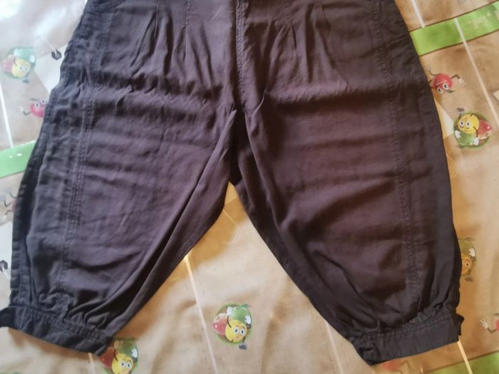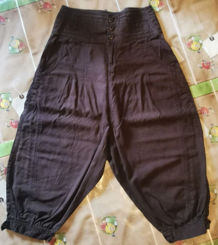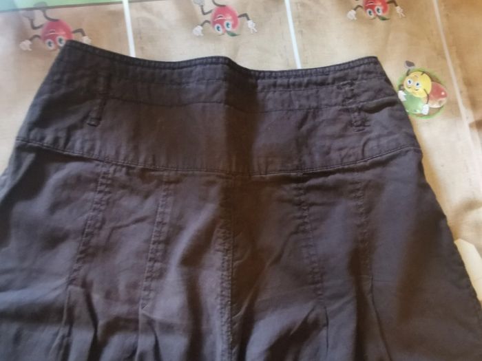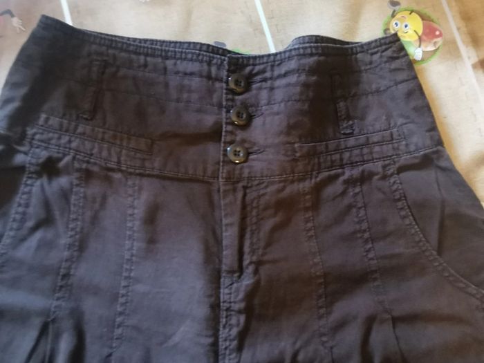 Pantalon taille 38 "promod". Marron foncé (la couleur est plus foncée que sur les photos), 3 boutons et fermeture éclair 2 poches latérales sur le devant, resserré sur le bas des jambes sur 2 positions avec 2 boutons. En très bon état. Longueurs : 81 cm Réduction sur les lots à partir de 2 articles achetés.