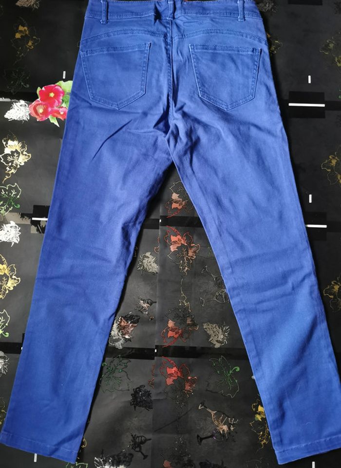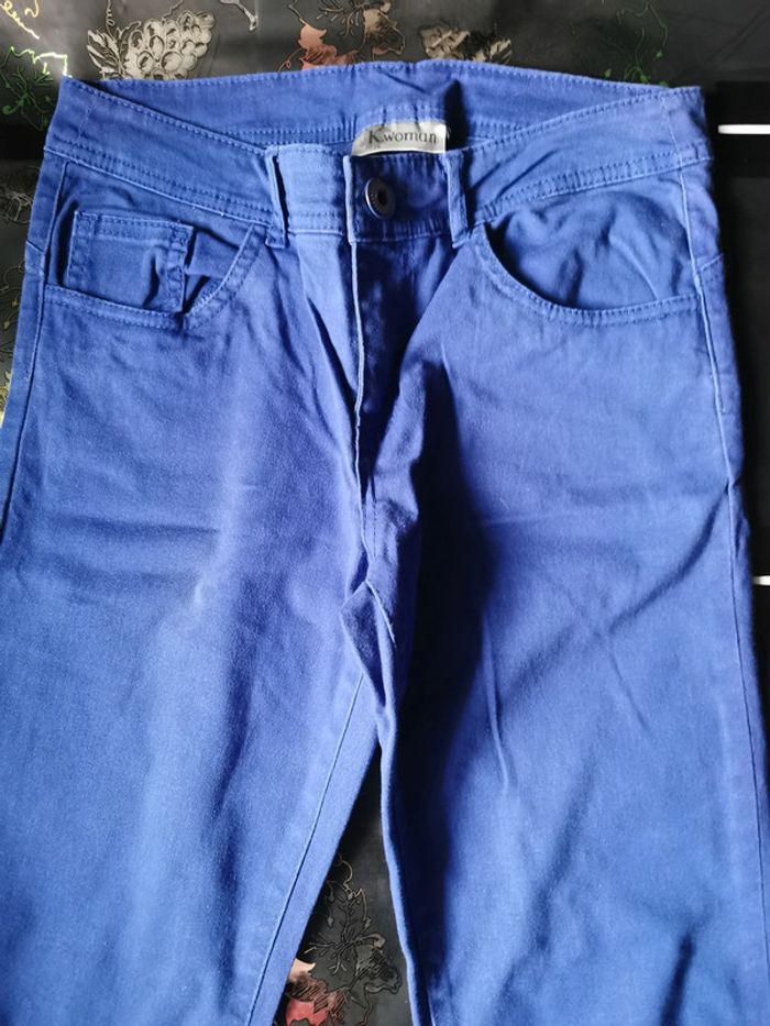 Pantalon bleu "Kwomen" taille 36. (la couleur de la photo 1 est celle qui se rapproche le plus de la réalité). Bouton et fermeture éclair. Passants pour ceinture. 2 poches plus 1 petite à l'avant et 2 poches à l'arrière. En très bon état.