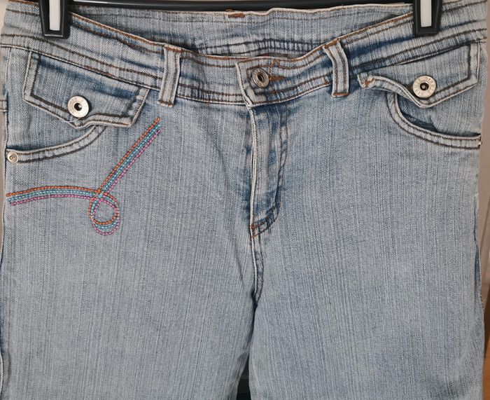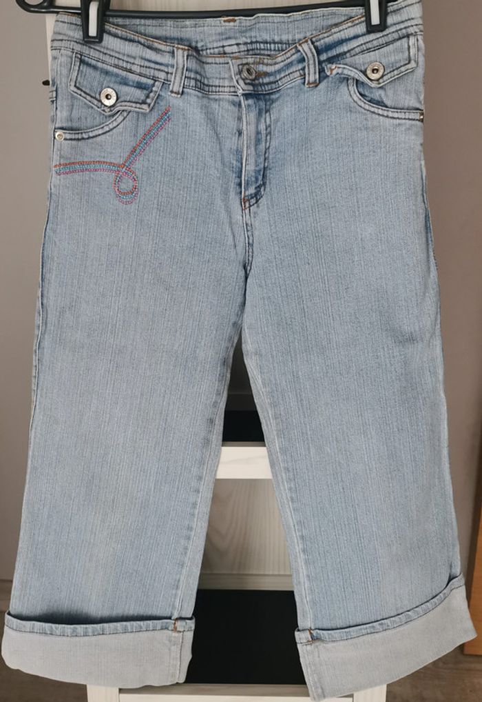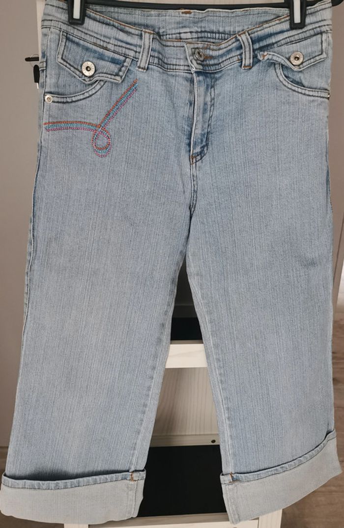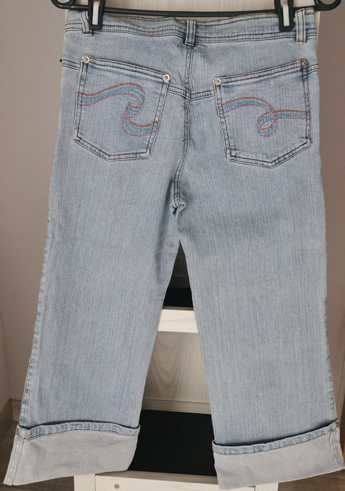 Pantacourt "SisMix" taille 36. Bleu clair avec surpiqure de couleur. Bouton et fermeture éclair. Passants pour ceinture. 2 poches à l'avant et 2 poches décorées à l'arrière. Gros ourlets sur le bas des jambes. En très bon état