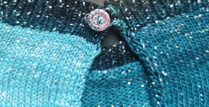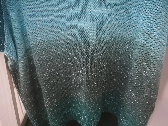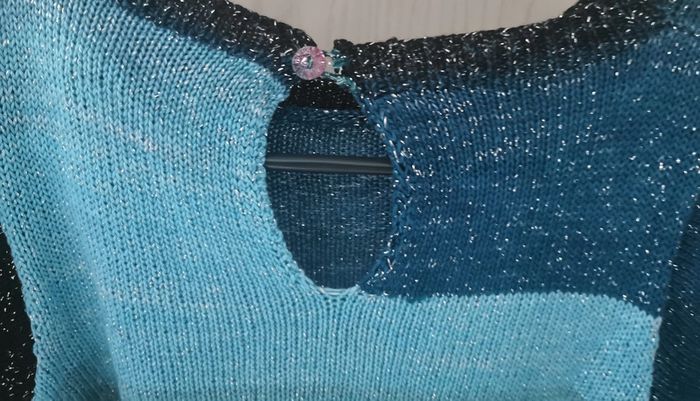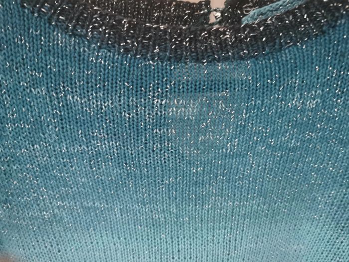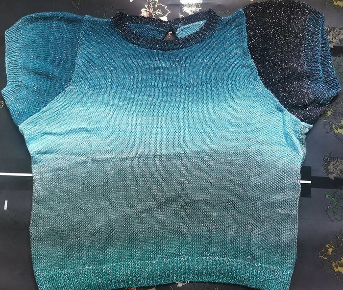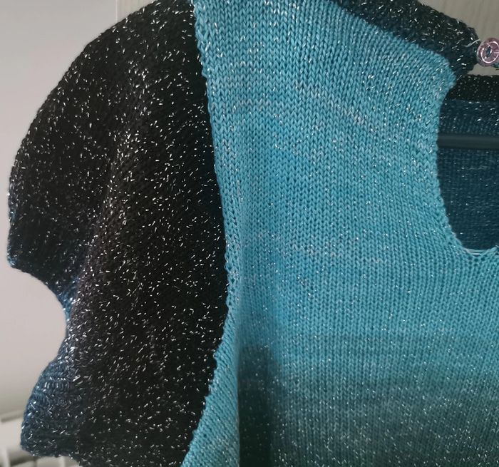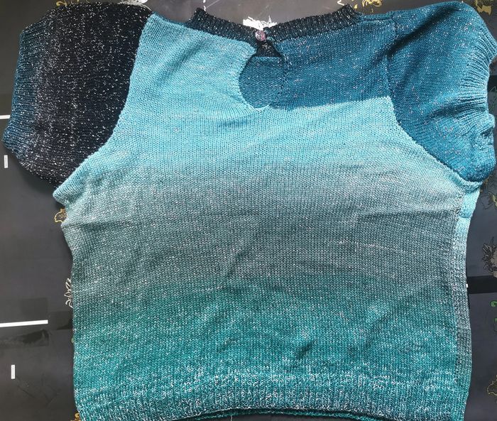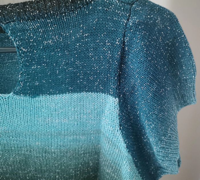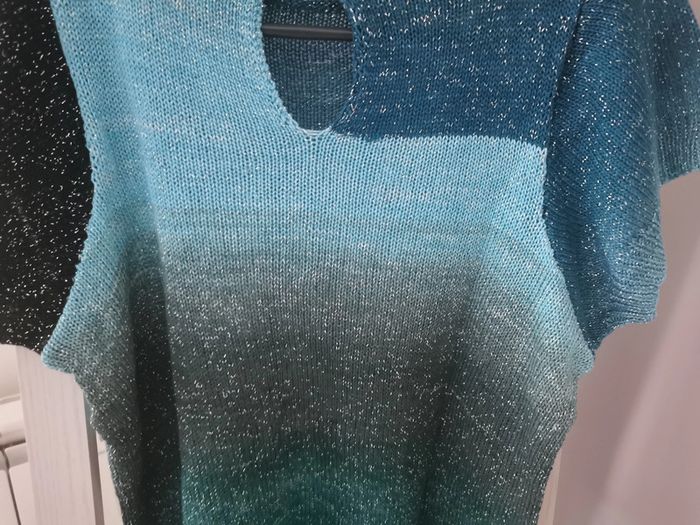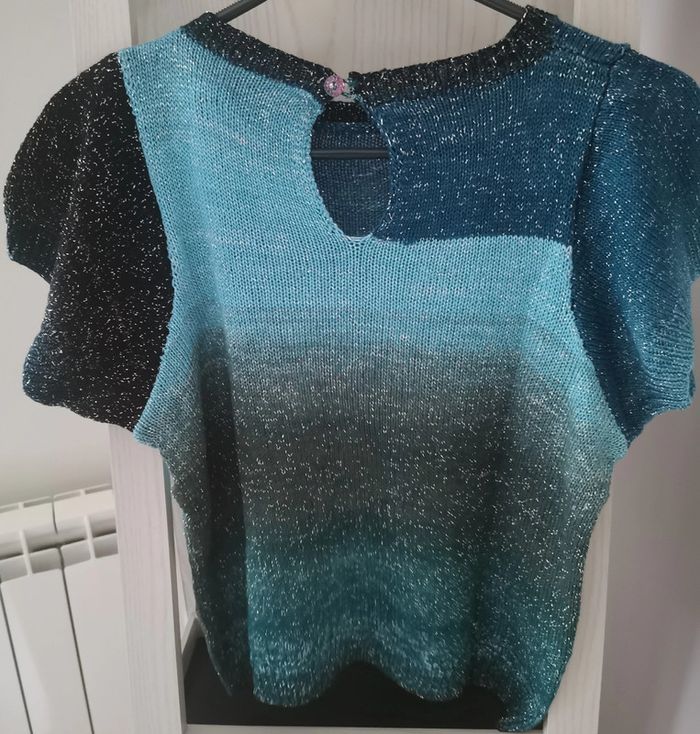 Pull en taille 42 tricoté à la main par ma maman qui est passionnée par le tricot et couturière de métier. Fin à manches courtes. Idéal pour la demi saison ou le soir d'été. Laine brillante avec différents bleus, noir et vert. Bouton fantaisie sur le derrière. Porté une seule fois. Dimensions à plat : - hauteur 45 cm - poitrine 50 cm Comme neuf