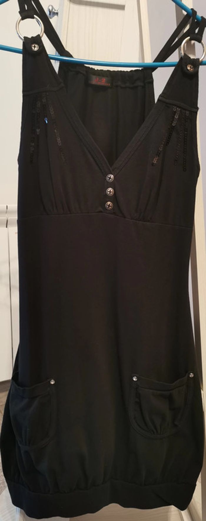 tunique ou robe noire taille unique correspond à une taille S/M. Jamais portée (juste essayé et lavée) trop petite pour moi. 2 poches sur le devant. Comme neuve.