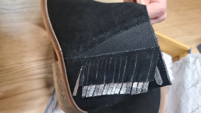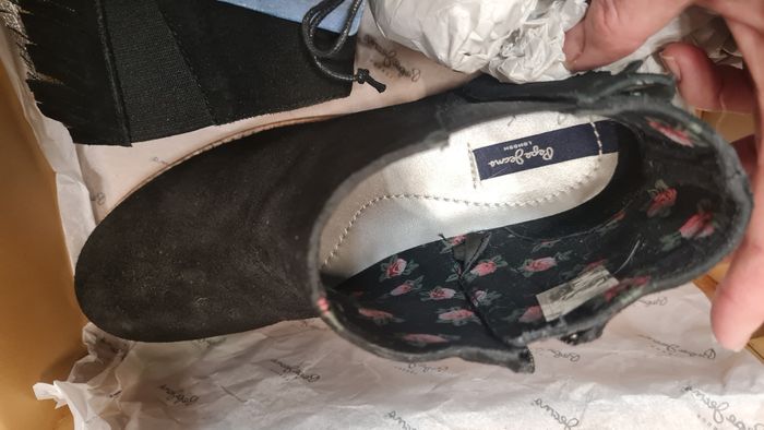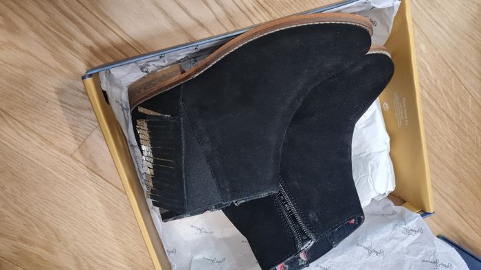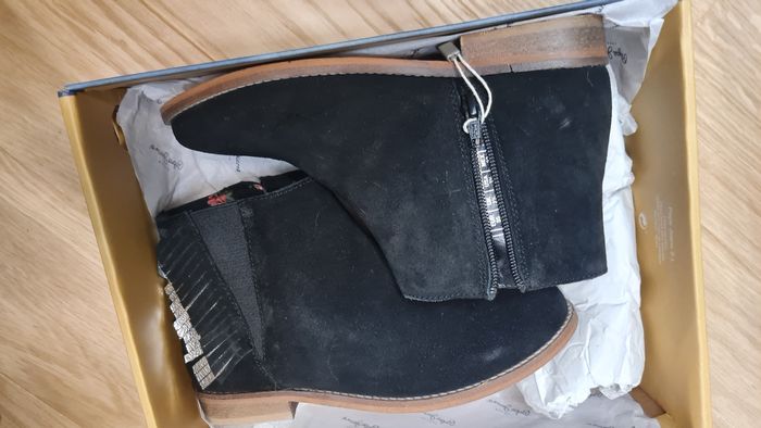 Bottines nubuck bleu marine et détails.gris métallisés. Fermeture côté par zip. Neuves jamais portées. Pointure 35. Achetées 85 euros