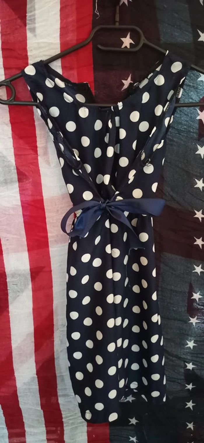 Jamais portée, lavée une fois Adorable robe bleue à pois blancs et nœud à la taille Longueur 67 cm Largeur 38cm Correspond à une taille enfant 6/8 ans