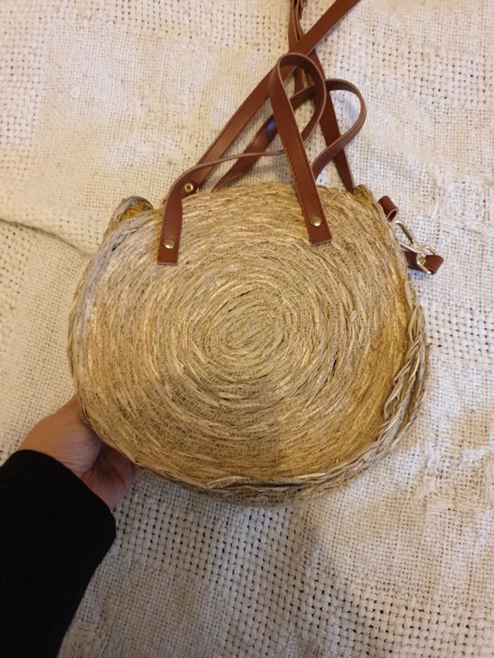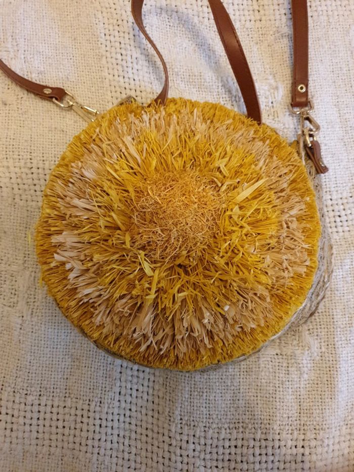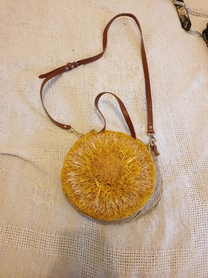 Sac en paille et jaune avec fleur en paille à bandoulière marron acheté chez bouchara