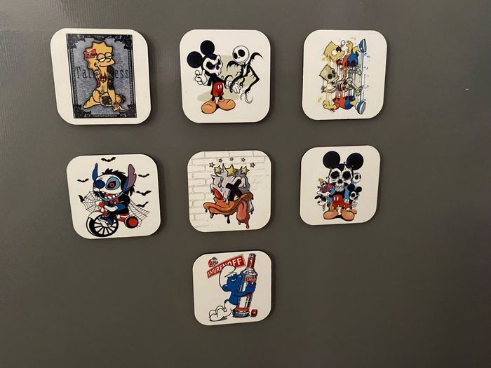 1 aimant 3€ 4 aimants 10€ Aimant Simpson, disney, schtroumpfs