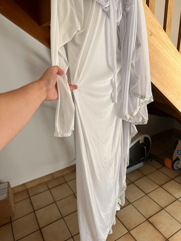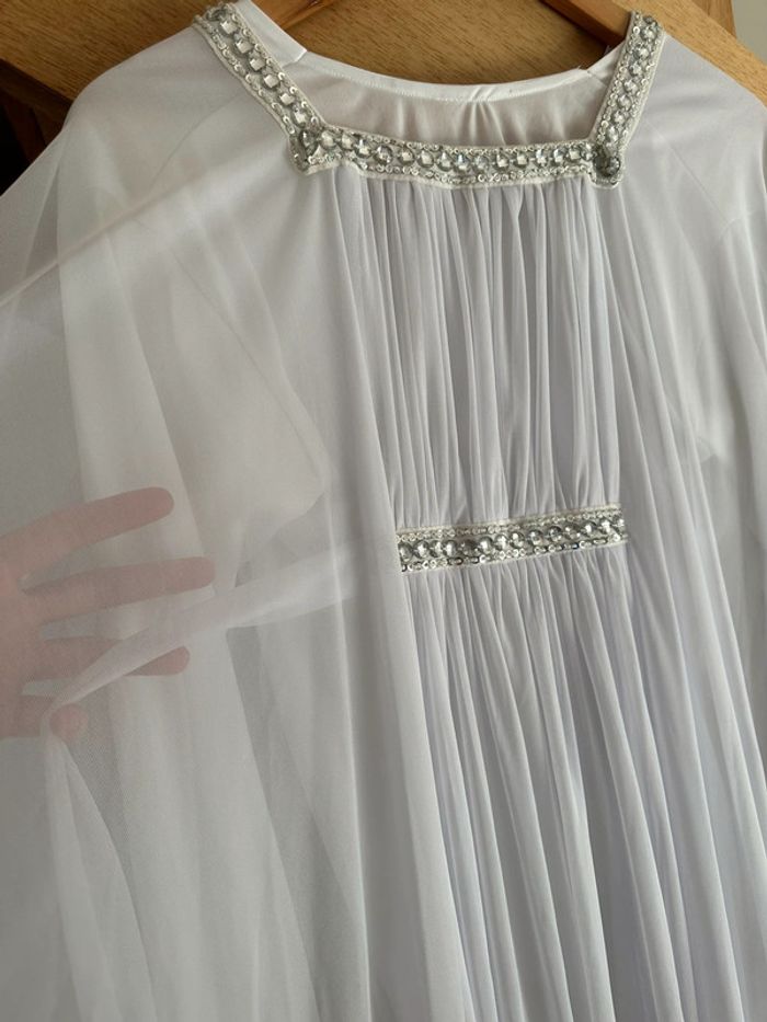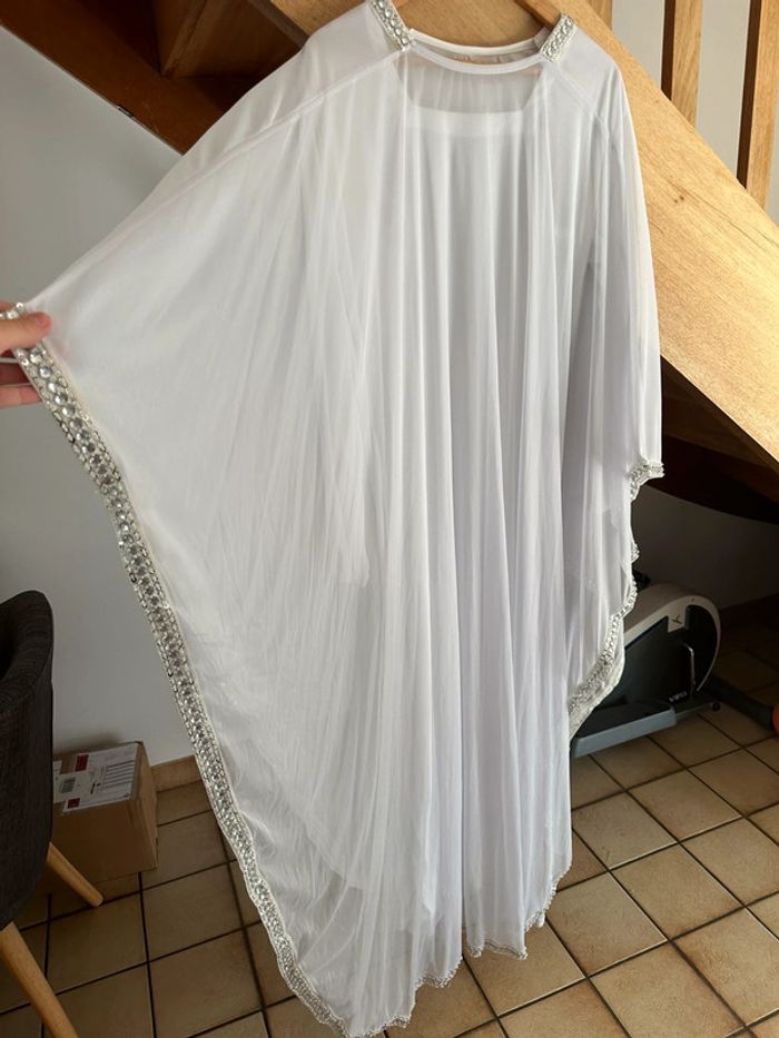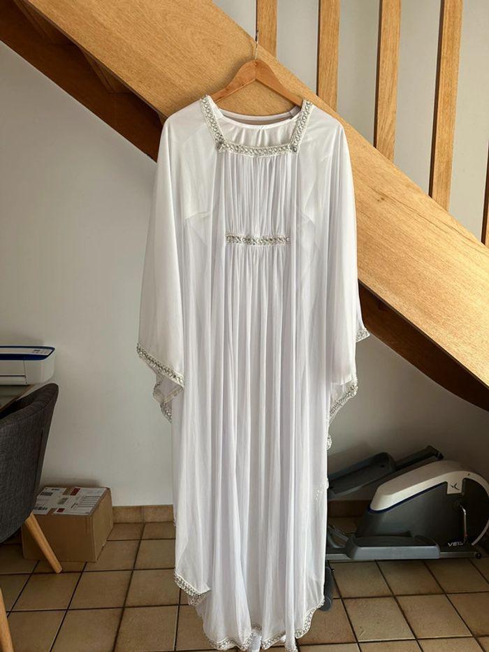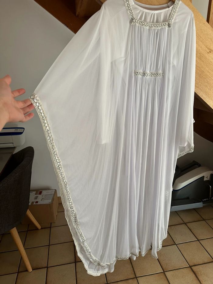 Robe de cérémonie, robe de dubaï Porté 1 fois Taille unique Robe blanche simple dessous pour éviter la transparence Ceinture à l’intérieur pour serrer la taille Fluide et légère Strass argentée Pas de tache, pas de trou, état neuf Magnifique rendu