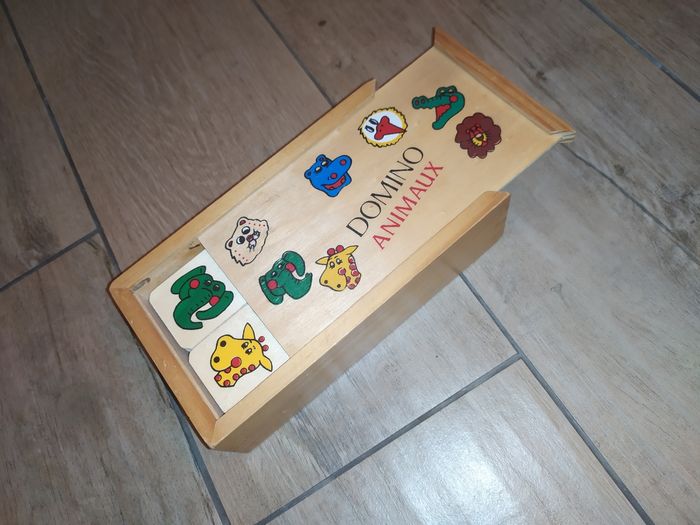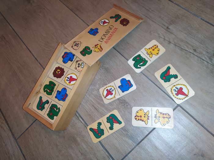 Vieux jeu de domino en bois En très bon état et complet Avec des animaux peints 🐊🦒🦁
