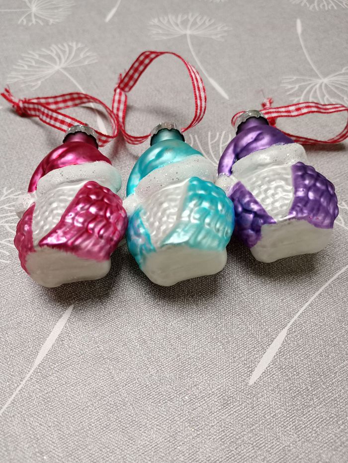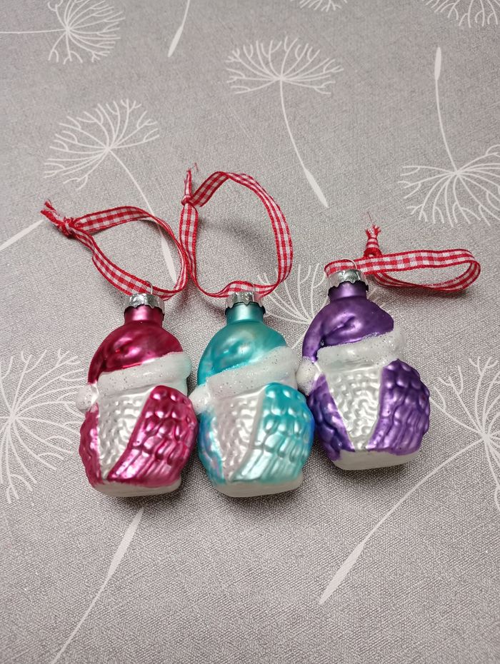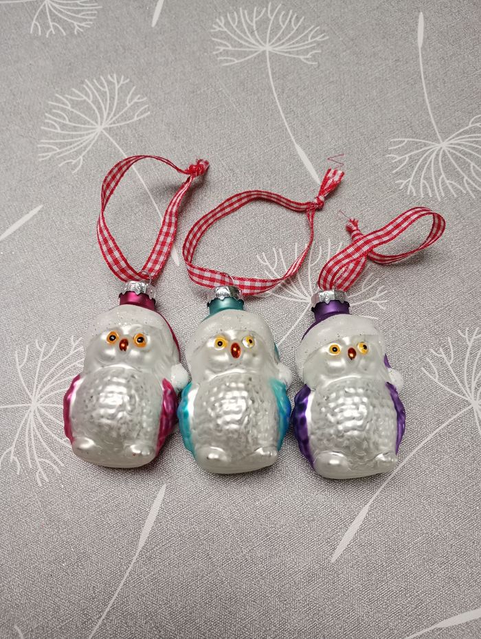 3 boules de Noël en forme de hiboux. Hauteur sans ruban : 7 cm. Très bon état.