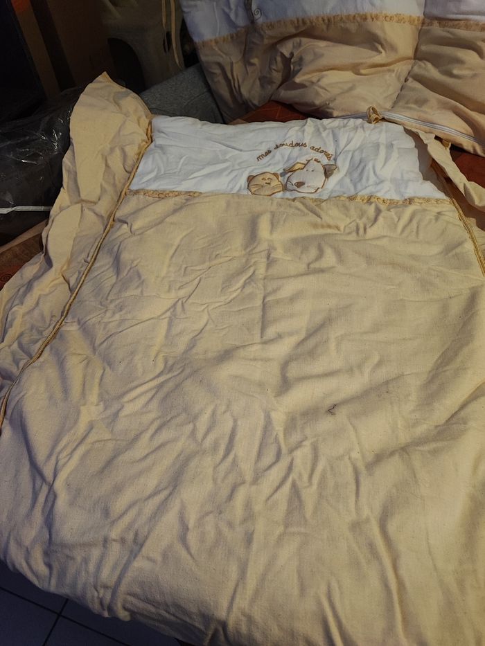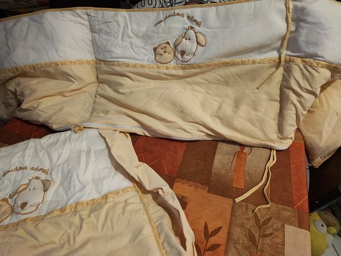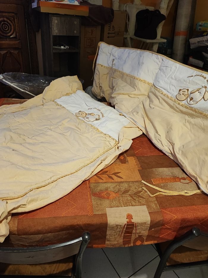 Vend tour de lit Et couverture 100% coton Déhoussable Lavage 30% N'hésitez pas à me contacter à prix à débattre Il faut qu'il parte