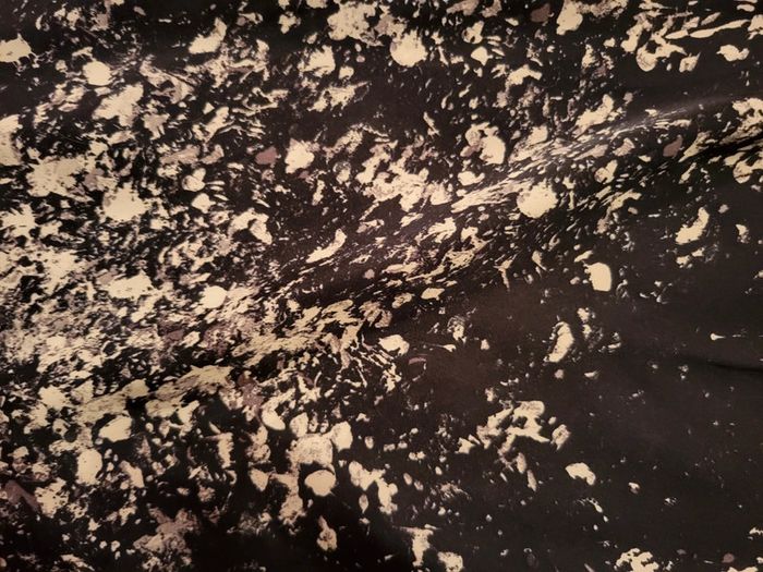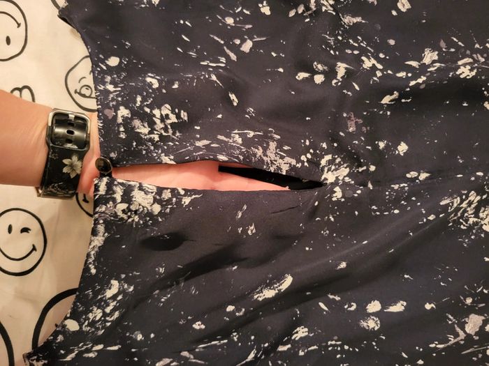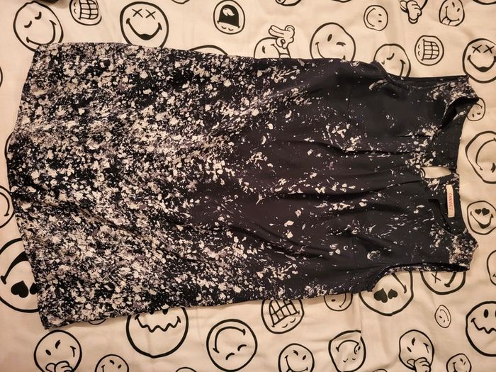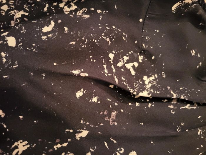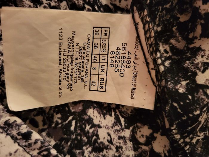 Bleu marine et blanche matiere satin .léger et très agréable à porter. Près du corps sans marquer les formes. Très classe et zéro repassage 😉