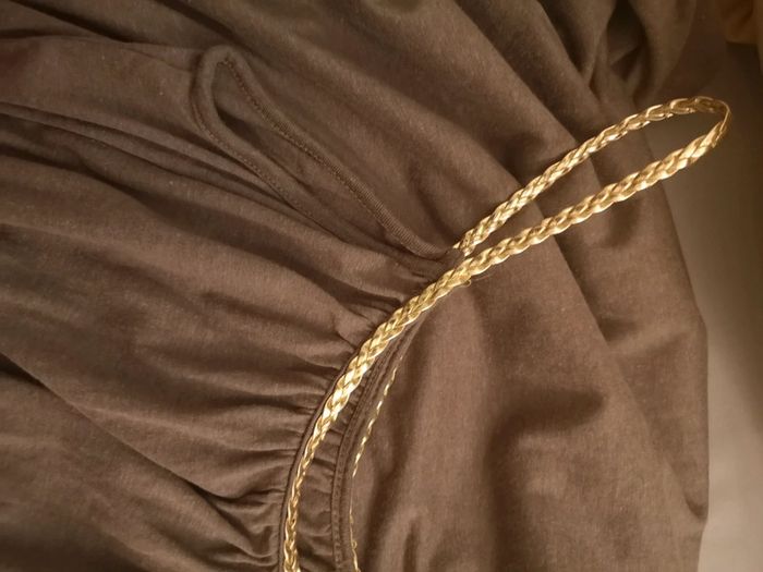 Superbe robe fluide. Cache les rondeurs .jamais porté Ceintré par un élastique très souple sous la poitrine Bretelle souple doré Longueur qui arrive juste au dessus du genoux. Ps je fais 1m61😉