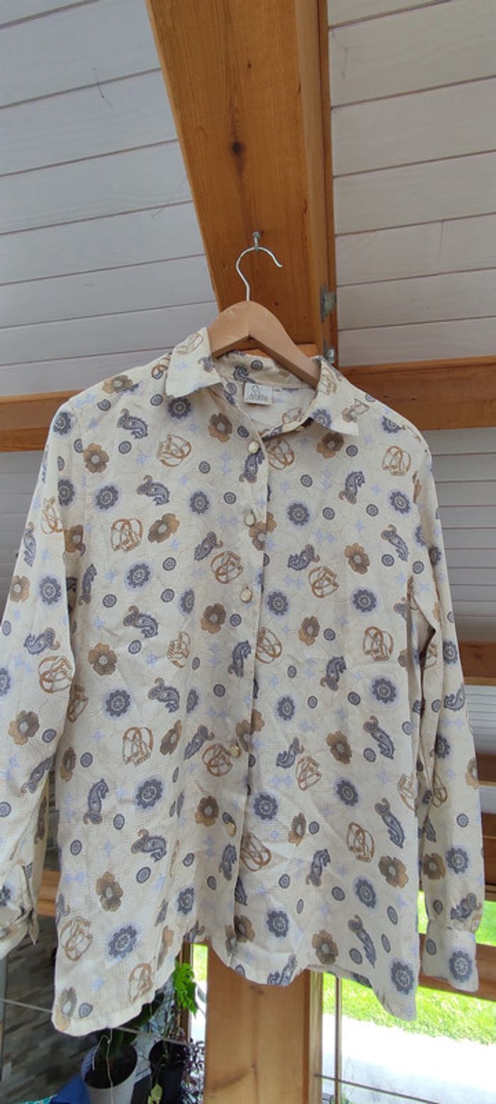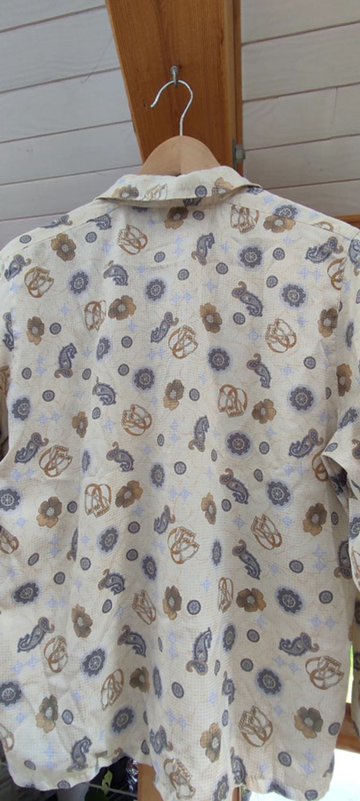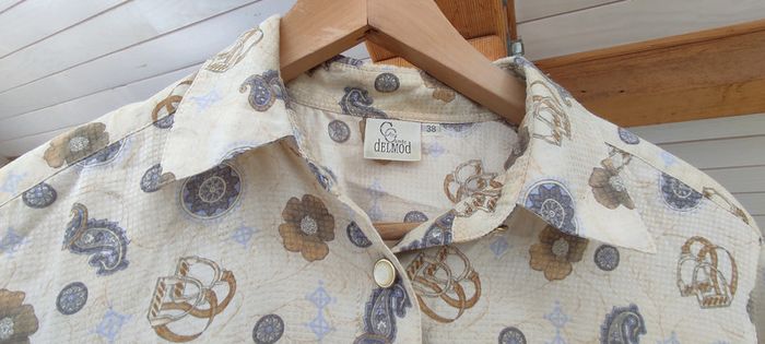 Chemise vintage à motif anglais 📌 Chemise couleur crème avec motifs or et beiges. Marque Delmond, léger, taille 38 il manque un bouton, voir photo mais mis a part cela, chemise en très bon état !
