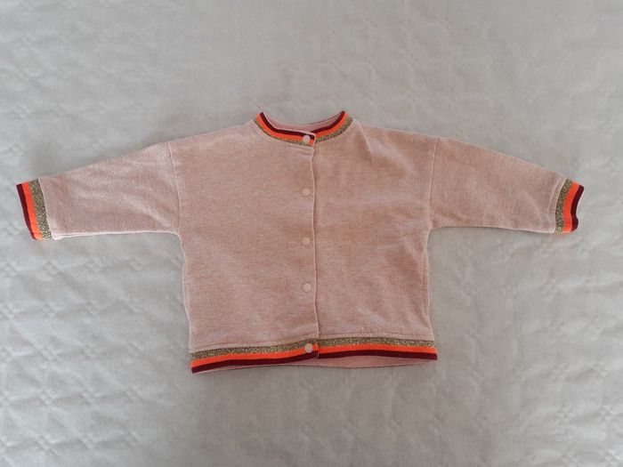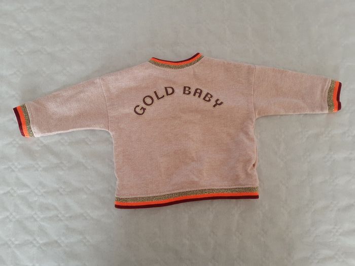 Blouson de type Teddy trop mignon, couleur rose pâle avec des dorures au col, aux poignets et à la taille, fermeture par des boutons pressions devant, gold baby écrit dans le dos