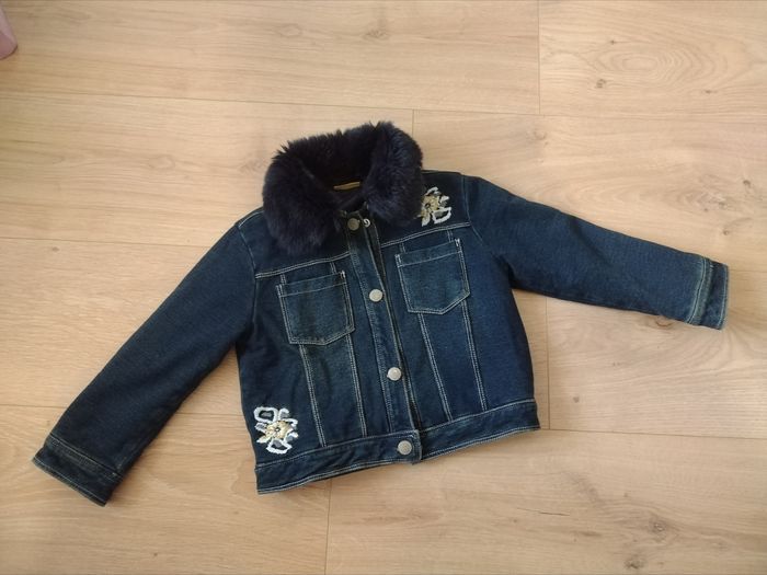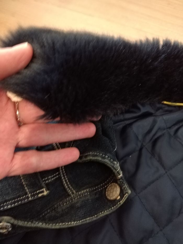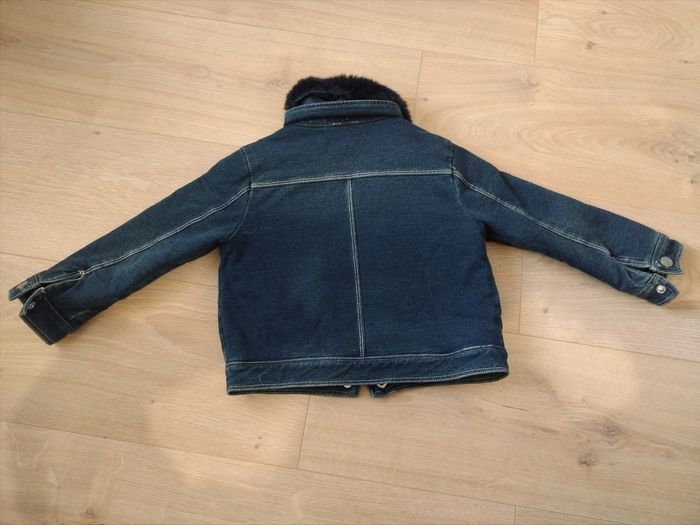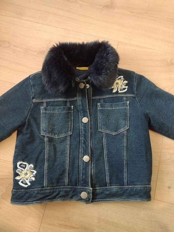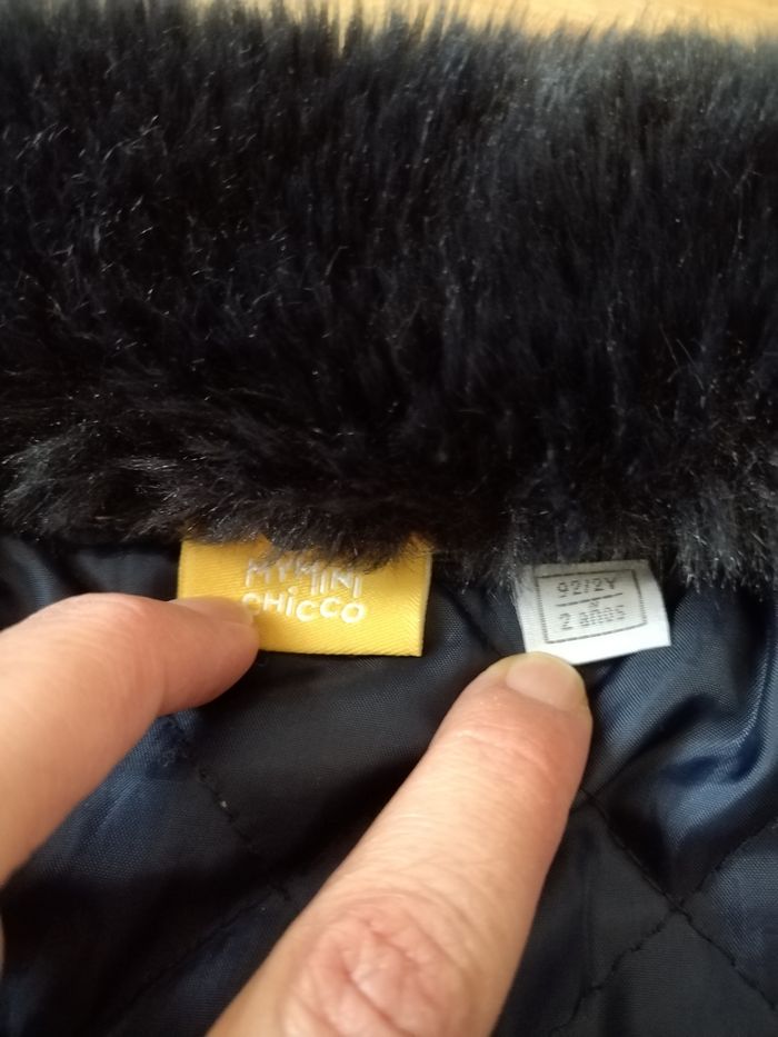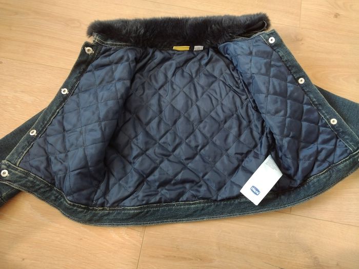 Blouson Chicco couleur jean, doublé, intérieur matelassé. Col en fausse fourrure amovible. Très peu porté, très bon état Taille 2 ans