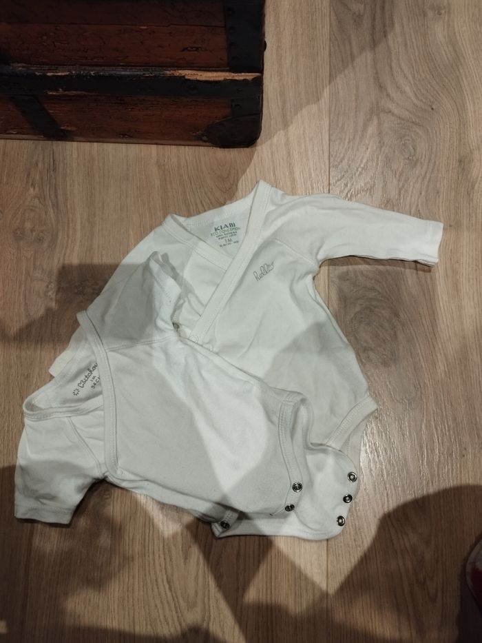 Lot de 2 bodies mixtes blanc 1 avec une inscription grise Kitchoun & Kiabi 1 mois