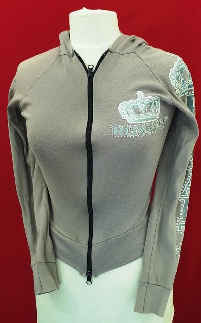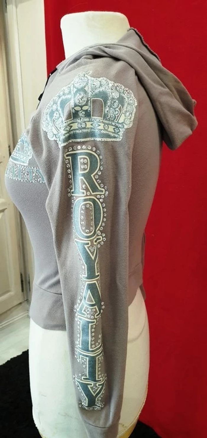 Gilet beige Royalty argenté Gilet beige / brun clair Transfert couronne et Royalty sur le devant et sur une manche Imprimé en argenté et crème Gilet près du corps 100% Coton