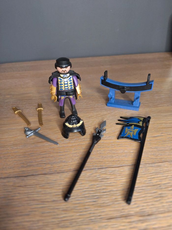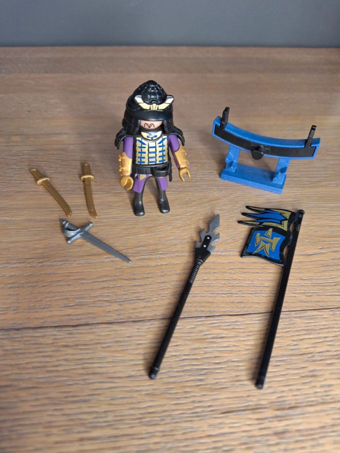 playmobil référence 4789 Personnage samourai et accessoires il manque la double épée et le demi cercle gris