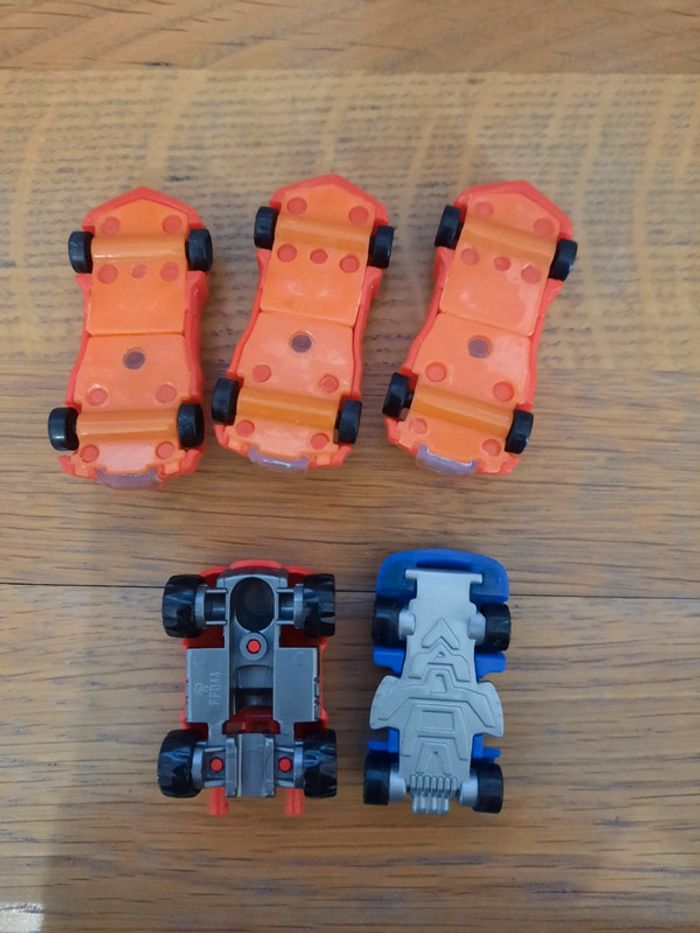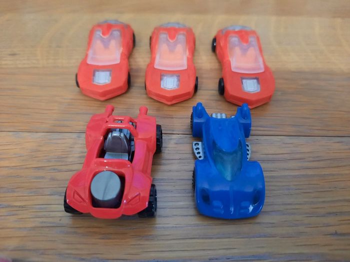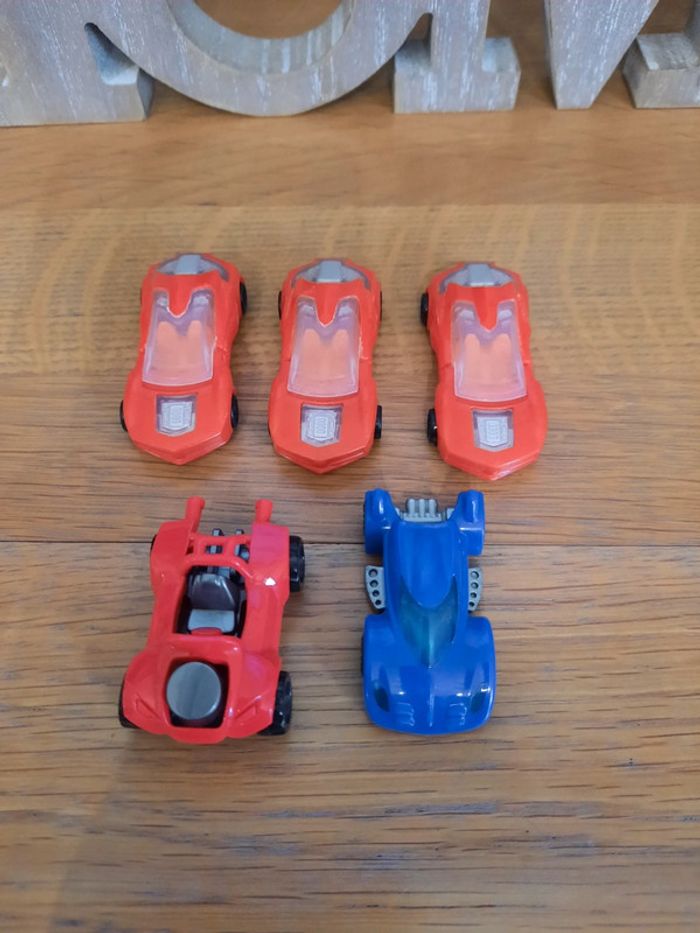 lot de 5 mini voitures en plastique les 3 rouges oranges font 5 cm de long les rouge et bleu font 3.5 cm
