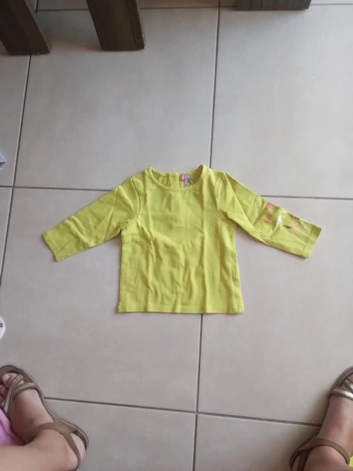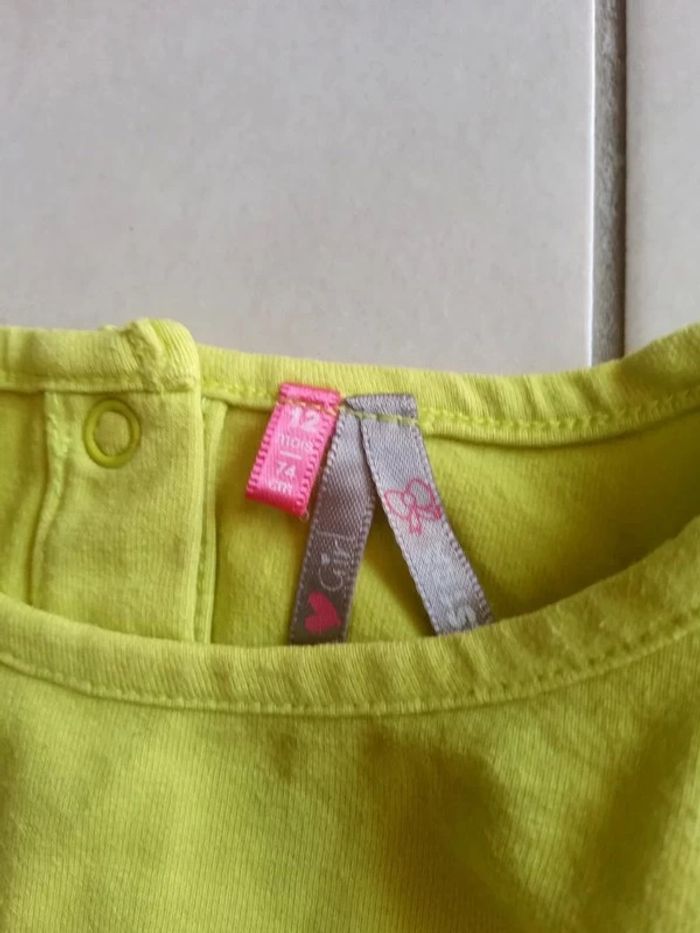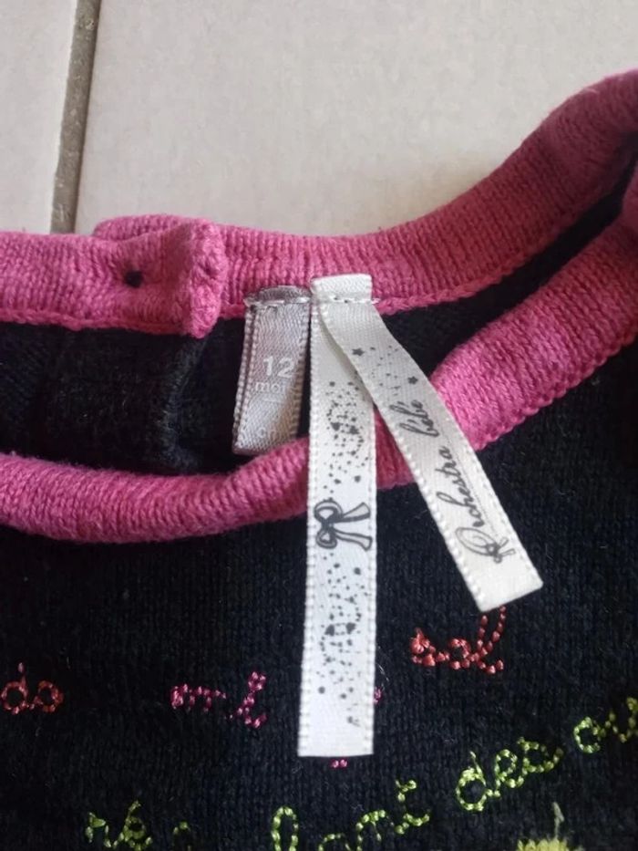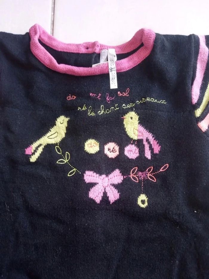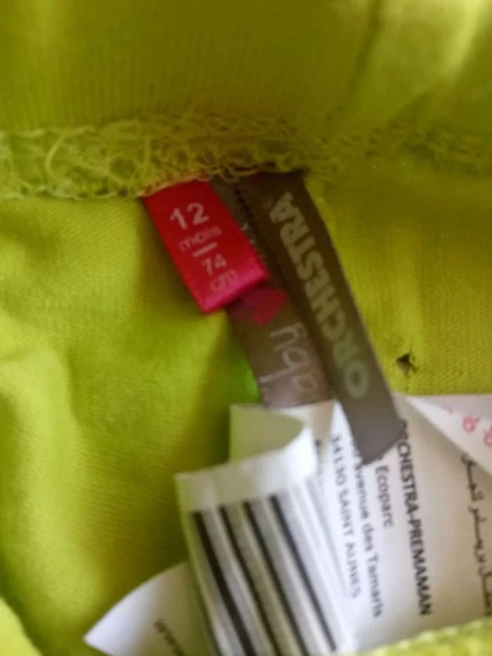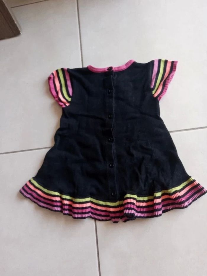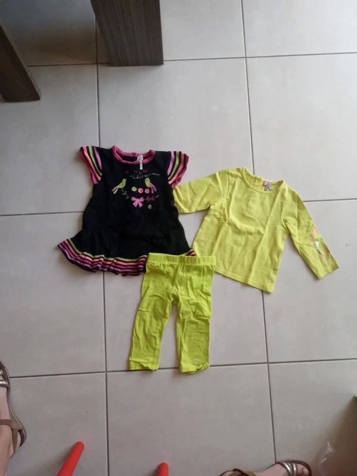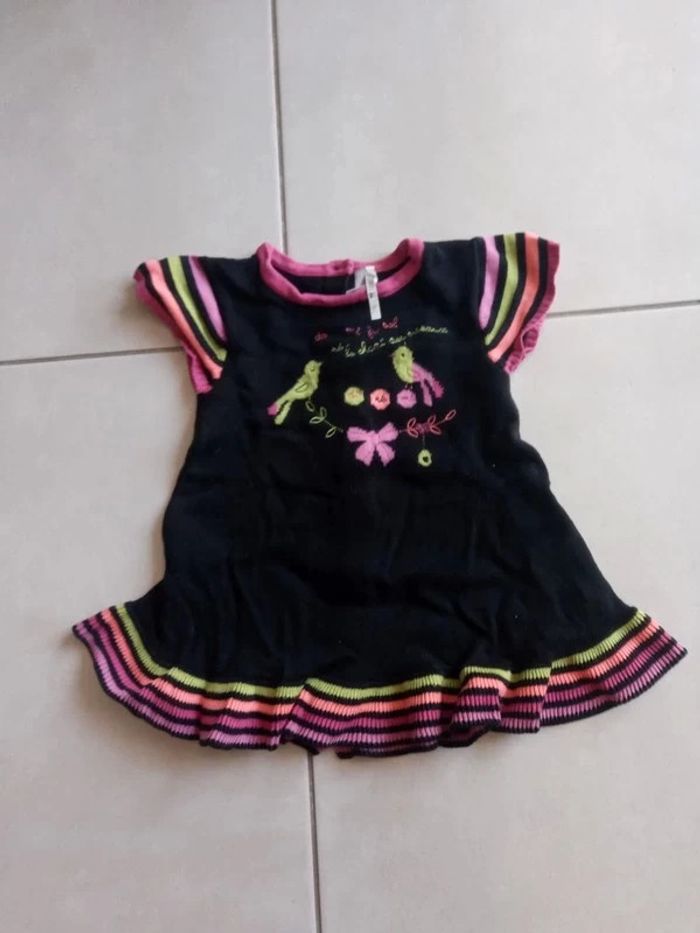 Joli ensemble 3 pièces comprenant : - 1 robe en coton noire rayé multicolore, avec dessins sur le devant, fermeture au dos par boutons - 1 Tee-shirt manches longues vert, manches avec dessins imprimés sur la manche gauche - 1 robe avec leggings vert (petit trou derrière, sous l'élastique) En très bon état, taille 12 mois #bertille0401fille12mois