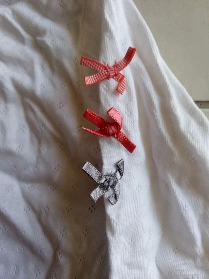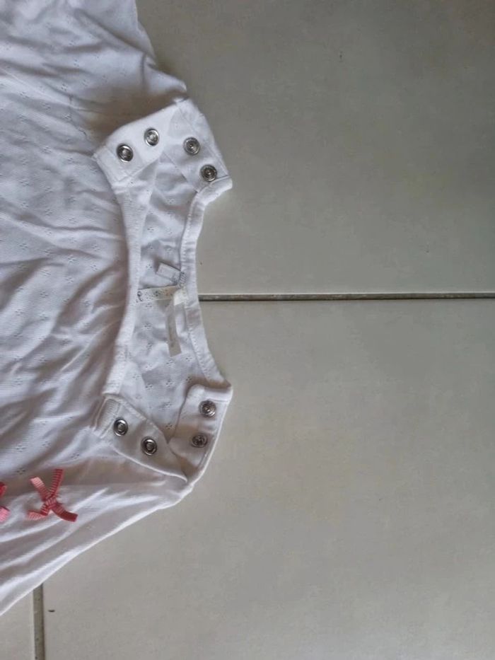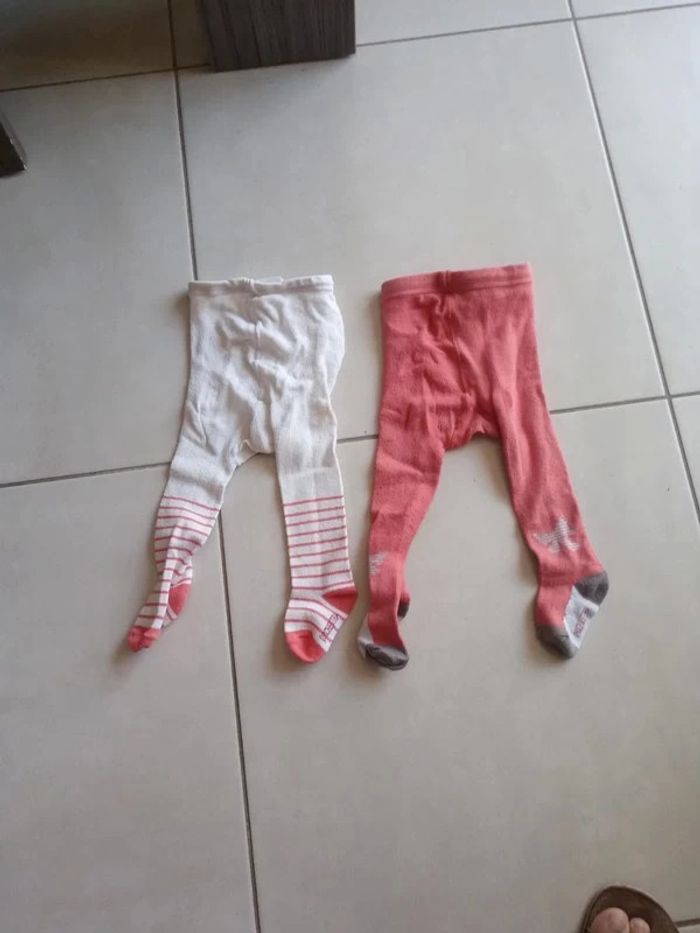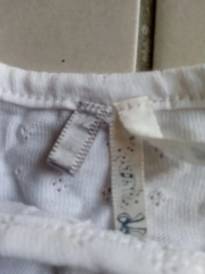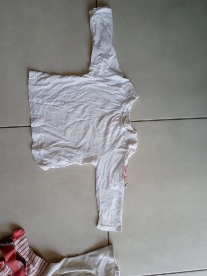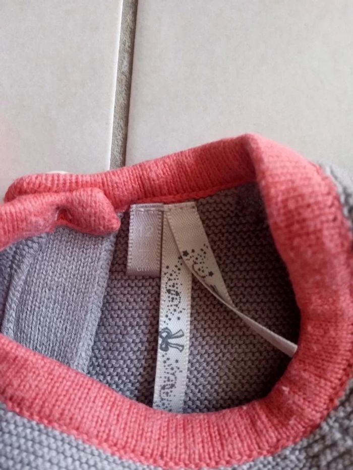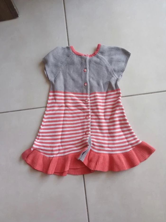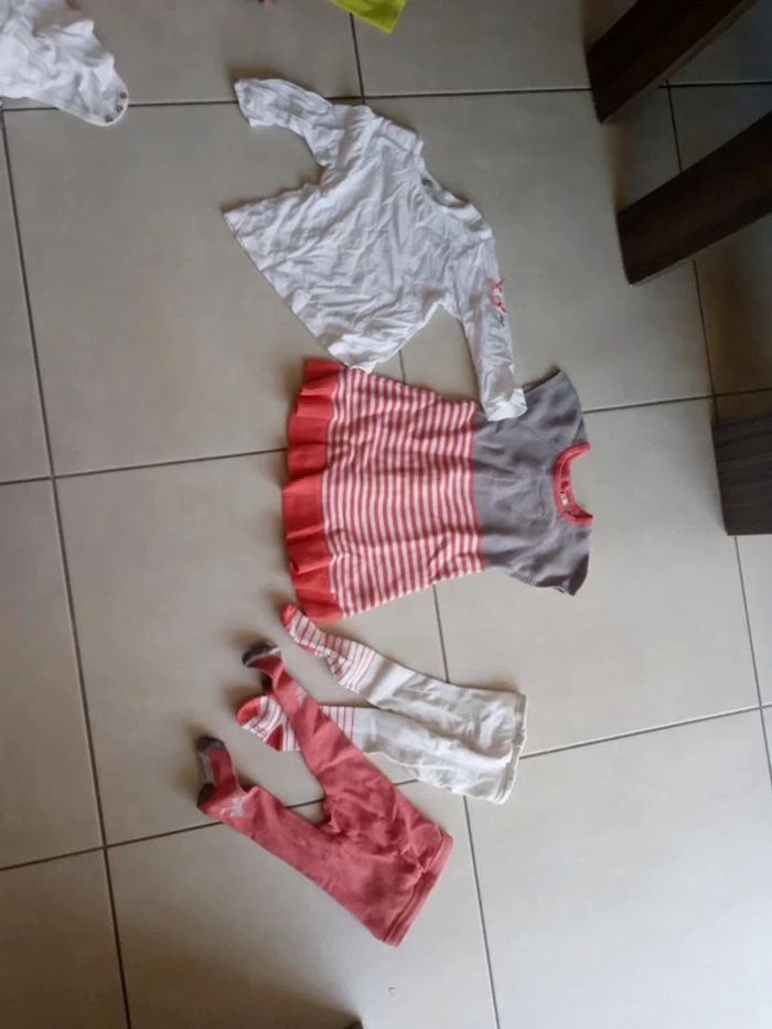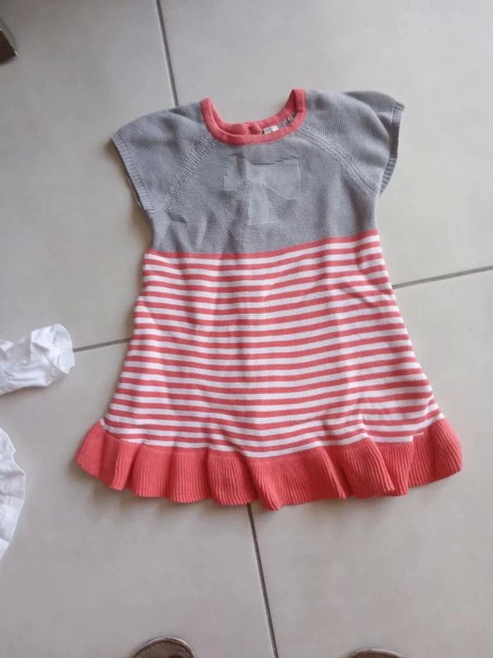 Ensemble 4 pièces comprenant : - 1 robe en coton, gris et corail, fermeture au dos par boutons - 1 tee shirt blanc, manches longues , avec 3 petits noeuds sur la manche gauche - 2 paires de manches collants Taille 12 mois, en parfait état #bertille0401fille12mois