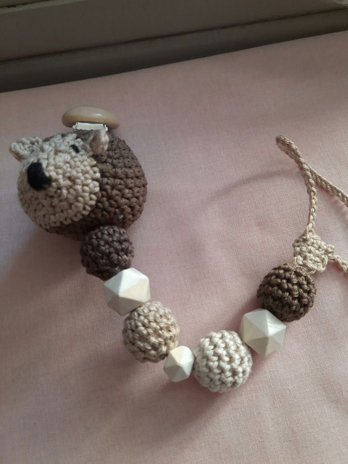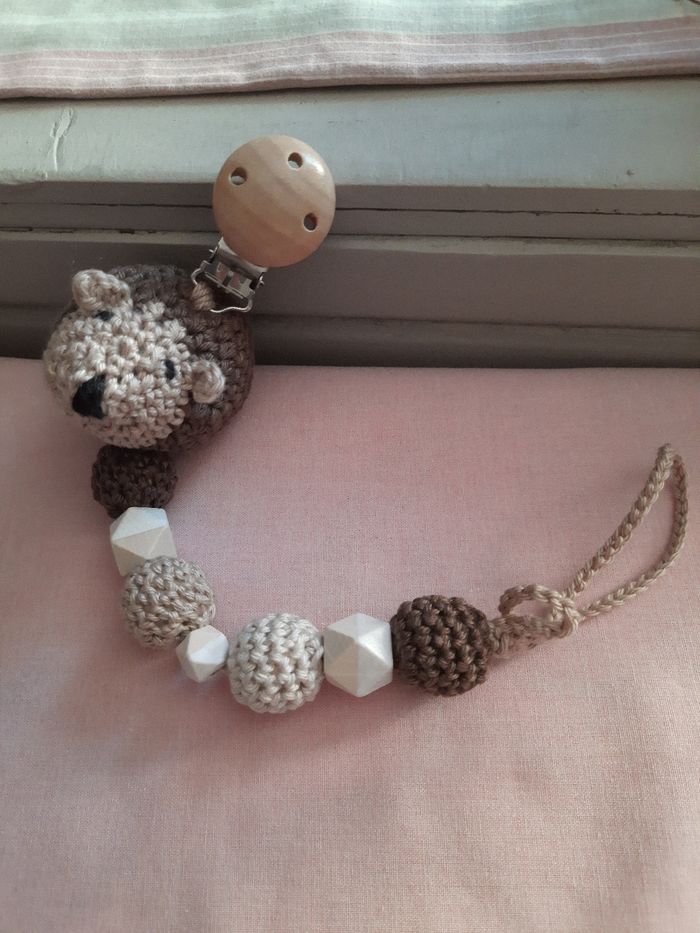Attache tétine hérisson, en coton, avec pince, perles en bois .