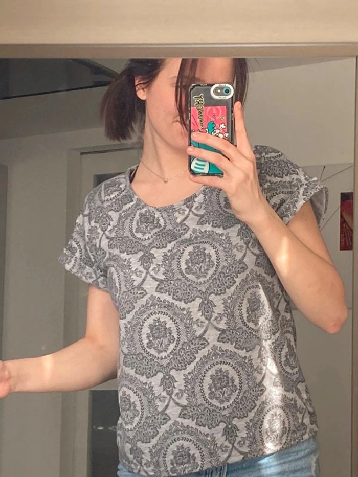 Pull léger à manche courte. Taille XS mais très bien pour un S ( comme sur photo). Noue au cou derrière / Morgan D