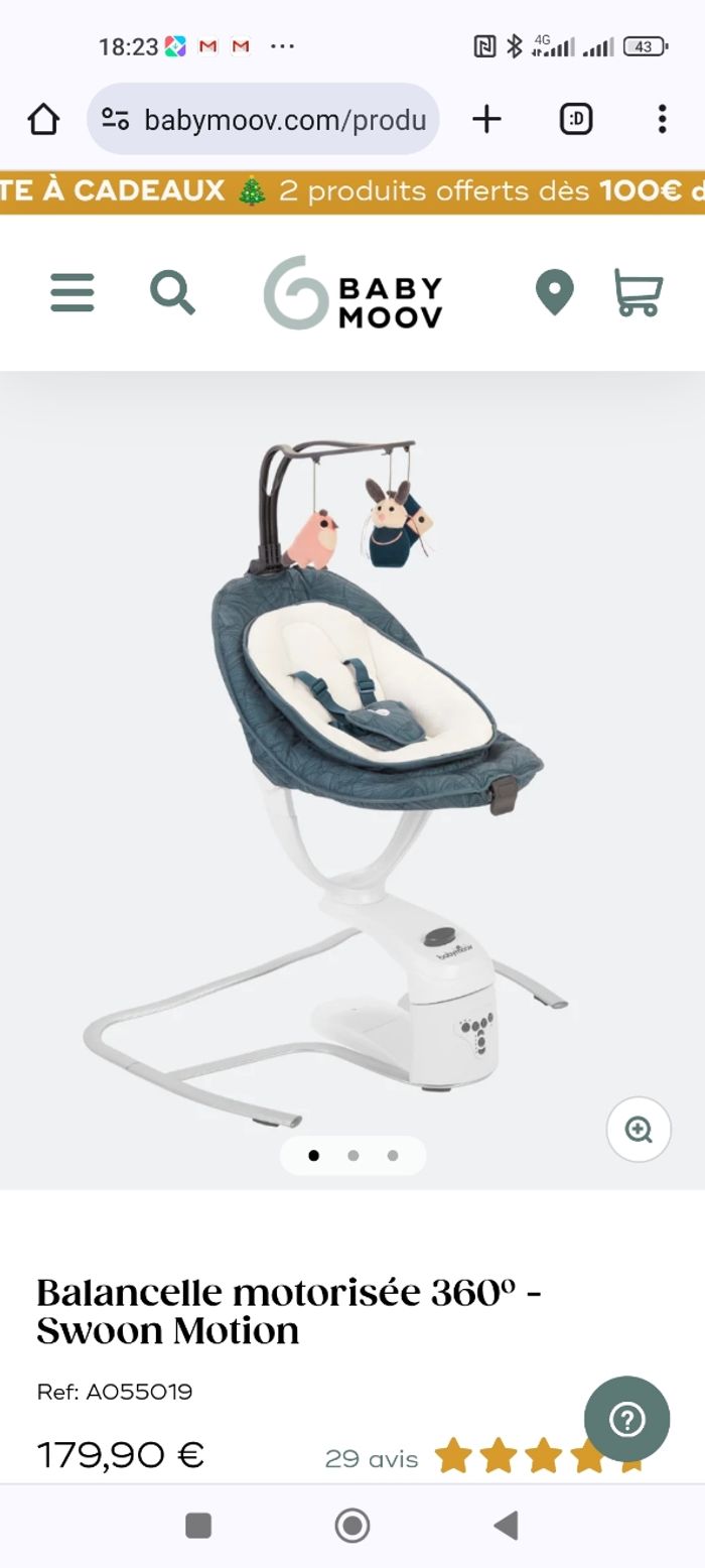 La balancelle idéale pour apaiser bébé avec ces 2 modes de bercement et son détecteur de mouvement. 2 modes de bercement : d'avant-arrière ou latéral Détecteur de mouvement pour déclencher le bercement aux mouvements de réveil de bébé S'adapte à chaque bébé : 5 vitesses de bercement et 3 positions d'assise Assise rotative à 360° Programmation du temps de bercement : 10, 20 ou 30 minutes Coussin réducteur pour nouveau-né intégré : véritable petit nid douillet grâce à ses matières douces 8 mélodies et berceuses pour apaiser bébé et l'aider à s'endormir Arche de jeux. Harnais 5 points offert: + Le coussin réducteur qui rassure et maintient votre bébé dans tous les environnements ! Effet réducteur avec rebords molletonnés pour rassurer votre bébé S’adapte à tout type de transat, balancelle, poussette, siège-auto, nacelle (harnais 2, 3 ou 5 points), avec sangles amovibles Coussin de tête morphologique intégré pour une tête bien ronde Tissu Coolmax® thermorégulant pour une meilleure ventilation acheté 65€ excellent état. servit 5 mois . très satisfaite. acheté neuf 179€ - facture garantie