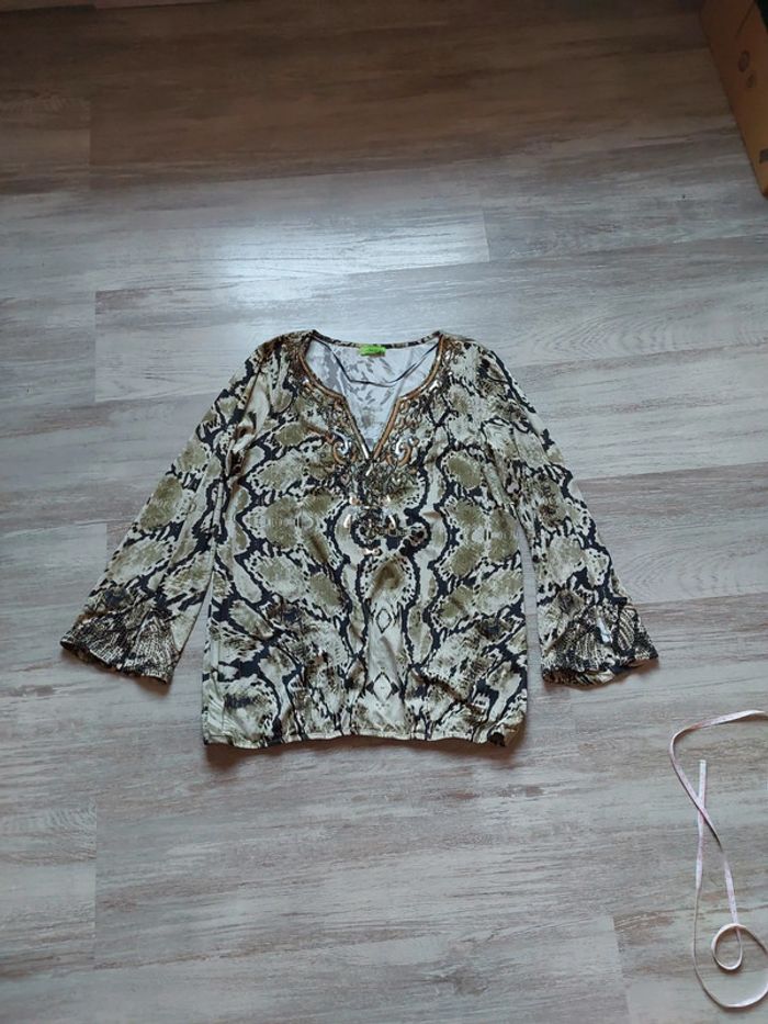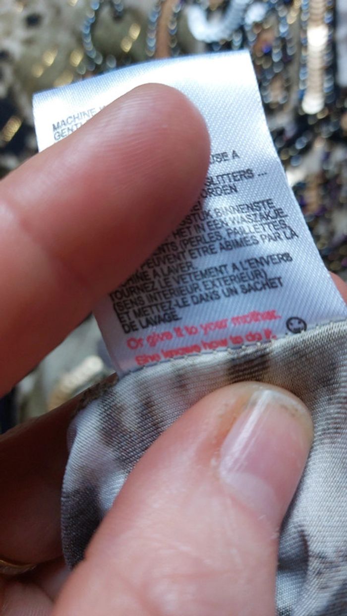 #jessicadebreufemmetaillel40 Pas d'étiquette taille Je le vends à regret car les manches sont trop juste pour moi 51.5 cm Les instructions de lavage en rouge m'ont bien fait rire