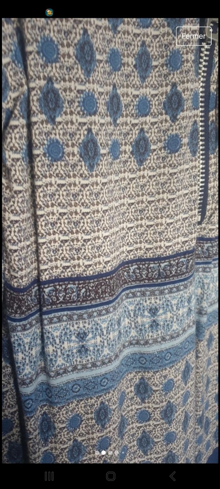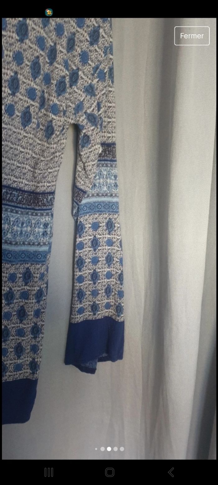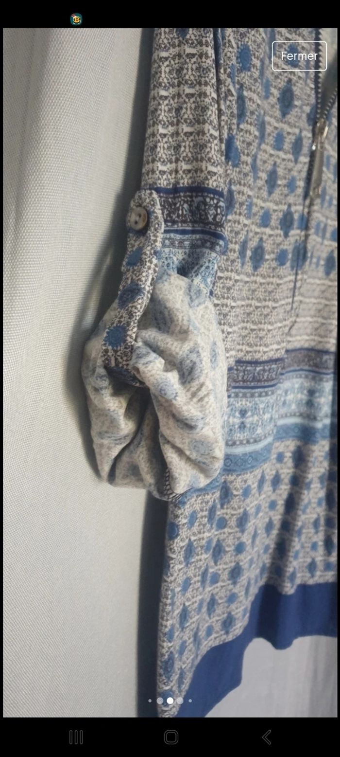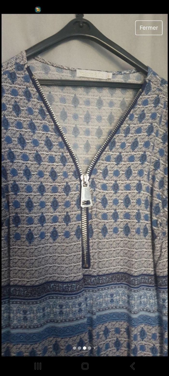 #chemise #blouse #blousefluide #mancheslongues #motifs Plusieurs tons de #bleu #bleumarine #bleuclair et #blanc #décolletév que l'on peut ajuster a sa guise puisque vrai #fermeture #argentée #manchesretroussables #tailleM/L Attention aux 40 si vous avez des épaules un peu larges elle peut paraître un peu juste a ce niveau, idéal #taille38 ou petit #taille40 #38/40 #tresbonetat